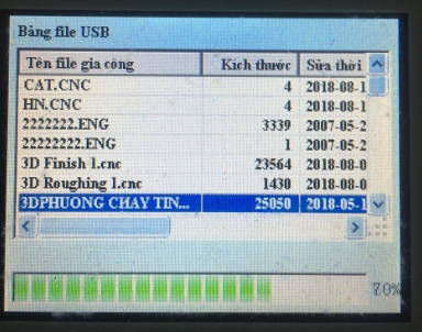 B3: Sử dụng “X+” và “X-“ để di chuyển lên xuống, di chuyển đến file cần chọn rồi ấn “OK” bộ điều khiển sẽ lưu file từ USB vào bộ nhớ trong của máy, đợi tải hết 100% là hoàn thành sao lưu file.